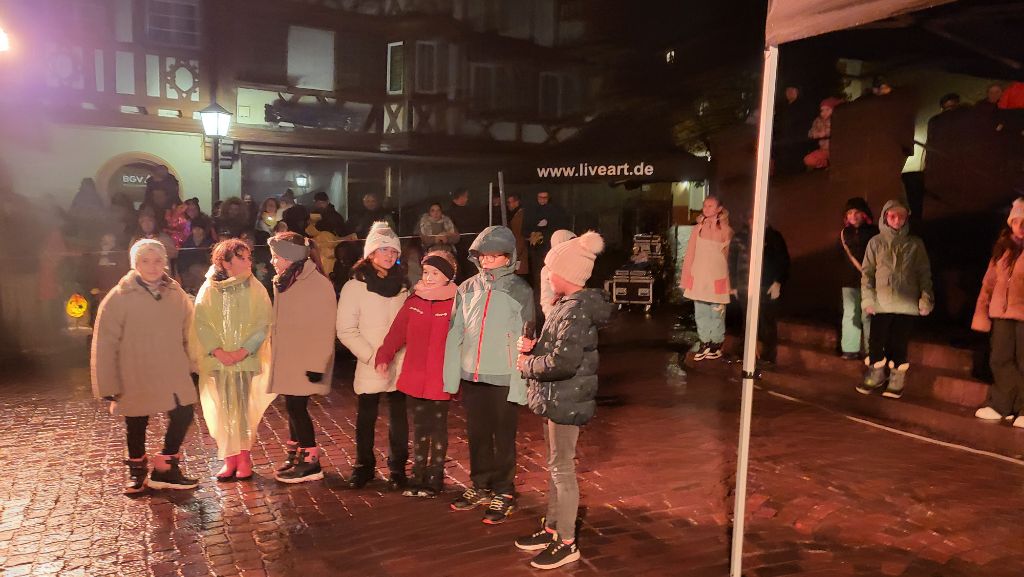 Die gebastelten Laternen wurden bestmöglich vor dem Regen geschützt. Nach unserem ersten gemeinsamen Lied „Kommt wir woll’n Laterne laufen“ machten wir uns hinter dem Martinspferd in Begleitung von Polizei und Feuerwehr auf den Weg in Richtung Marktplatz. In Mitten der Mosbacher Gassen legten wir eine Pause ein und sangen „Heute leuchten die Laternen“ und „St. Martin“, bevor wir den großen Marktplatz erreichten.