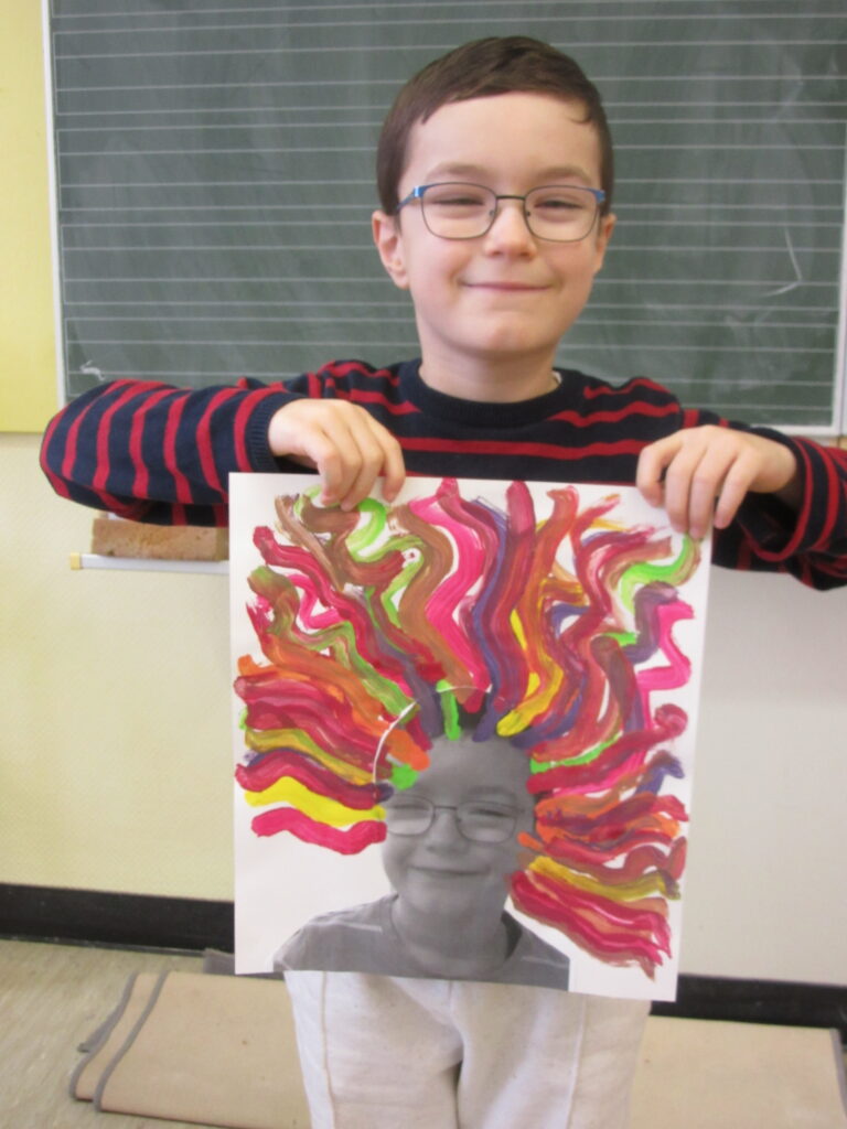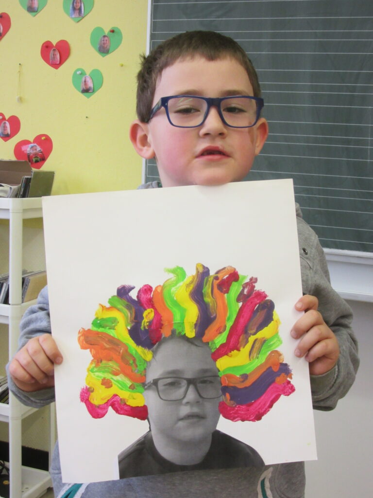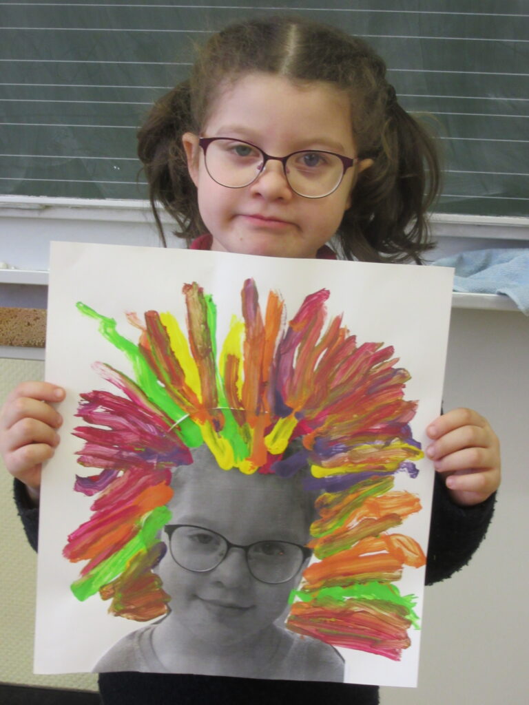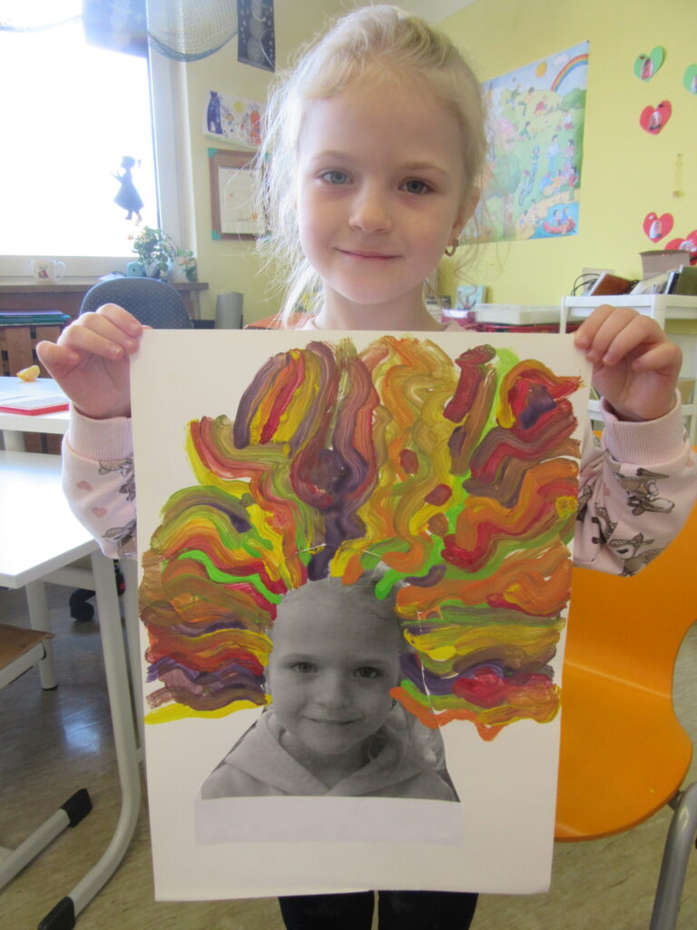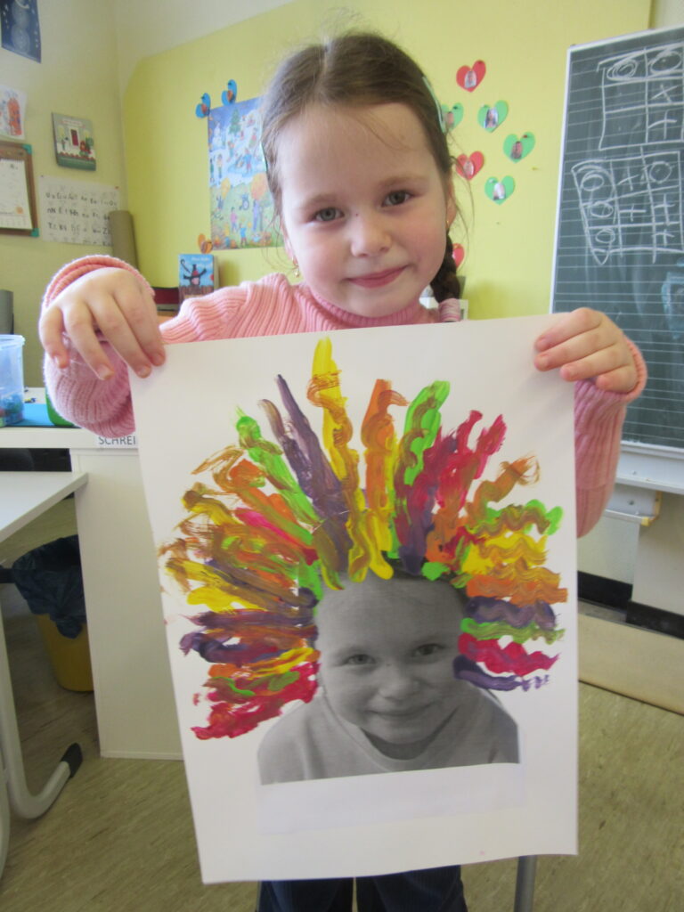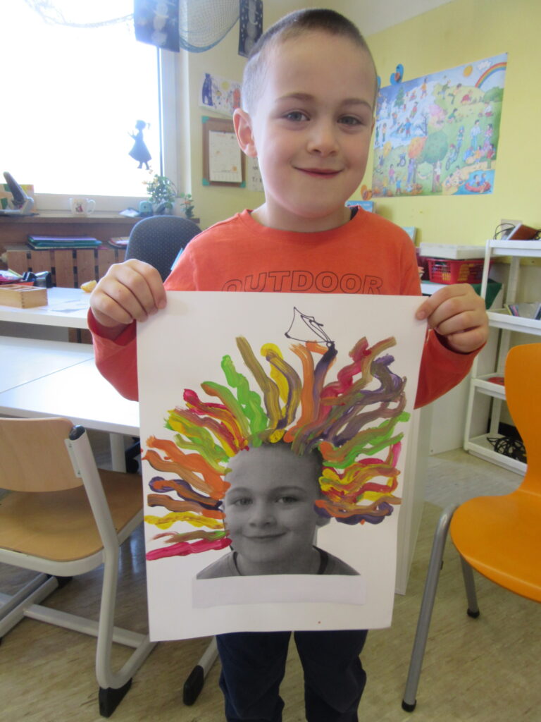 Zum Motto: „Faschingszeit“ malten sich die Kinder eine phantasievolle Clownsperücke aus einem zuvor geknispten Selbstpotrait.