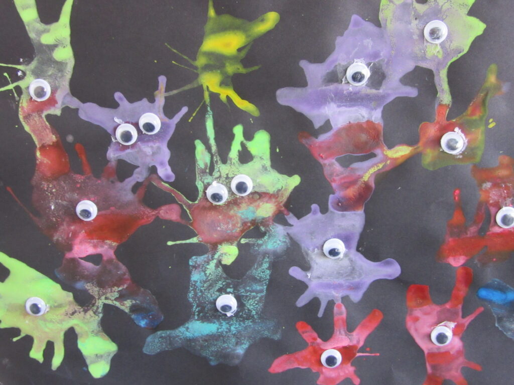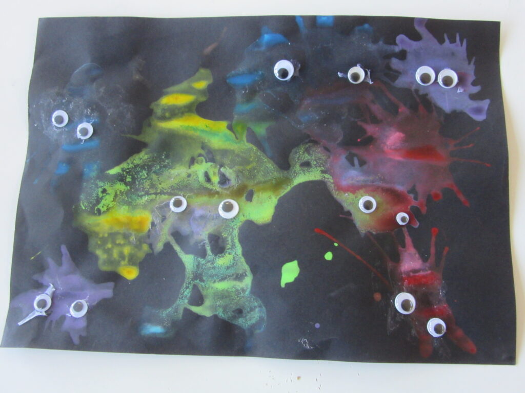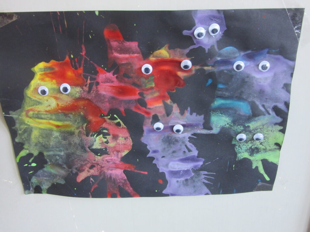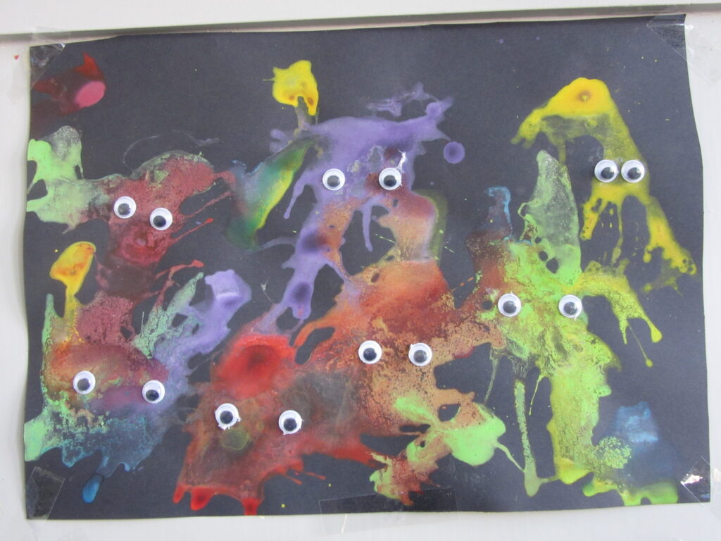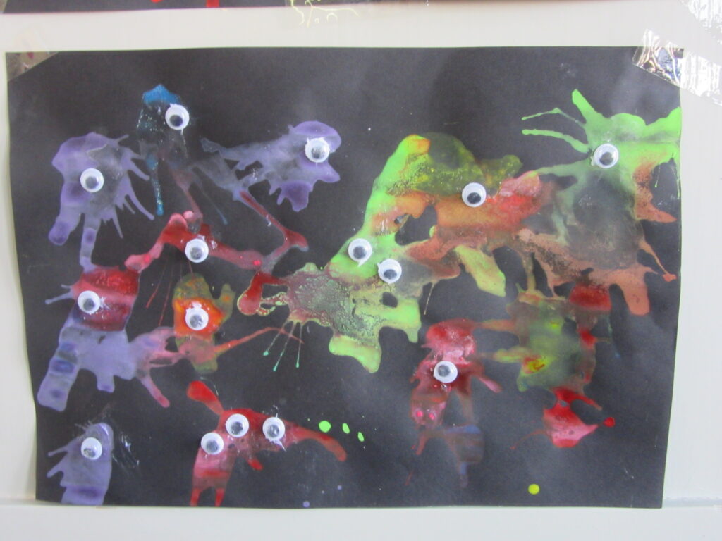 Immer noch zum Thema „Faschingszeit“ gestalteten die Schüler, mit Hilfe einer mit Fingerfarben gefüllten Pipette und der anschließenden Pustetechnik, “kleine Monster“ mit Wackelaugen.