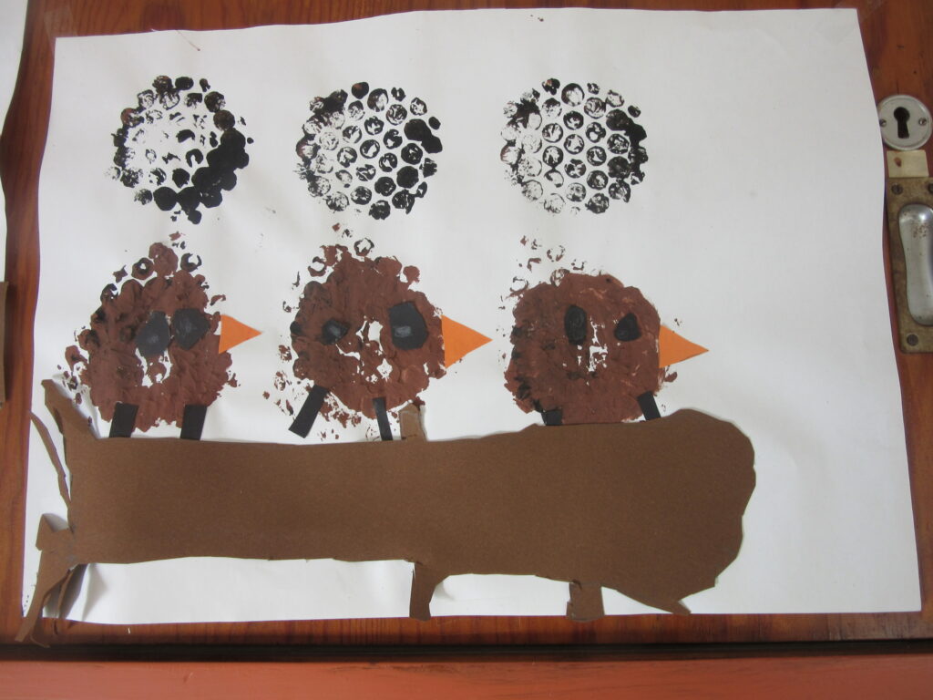 Zunächst beschäftigten wir uns mit der Winterzeit und den Tieren, die bei uns überwintern; über das Gedicht: „Die drei Spatzen“von Christian Morgenstern entstanden Bilder mit einem Pluster-Folien-Druck.