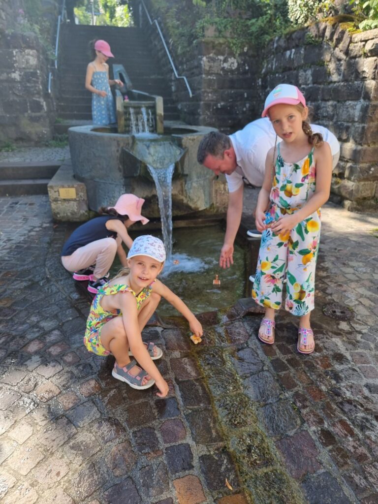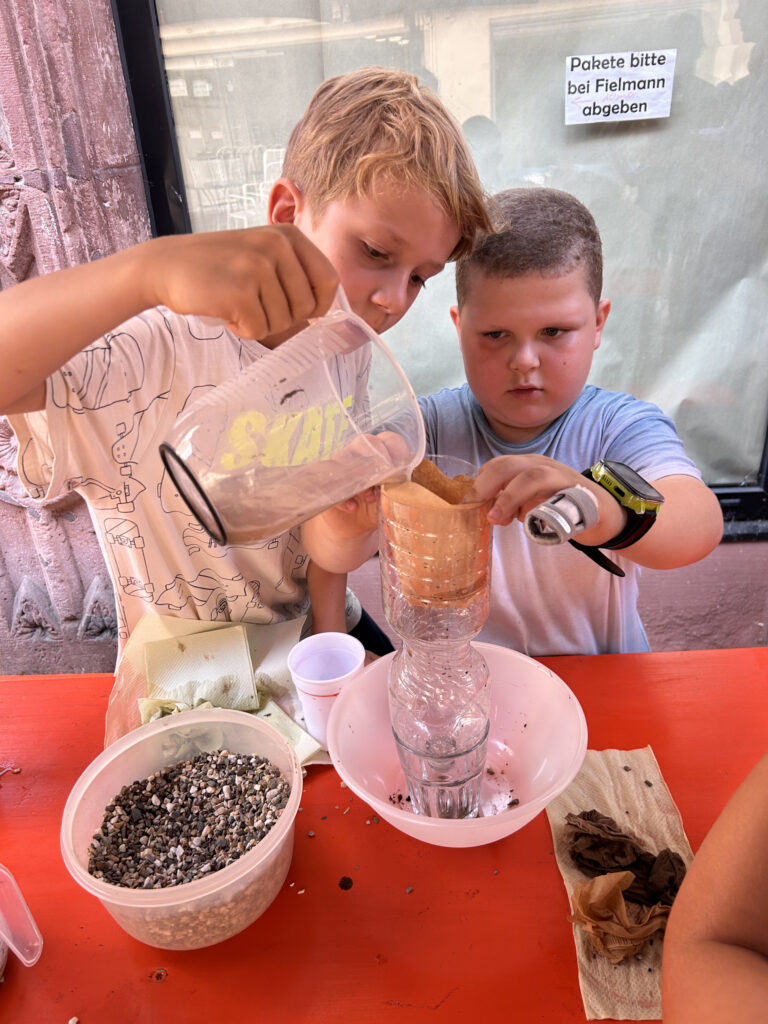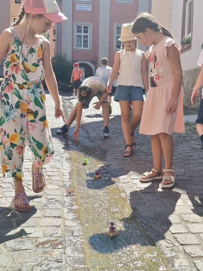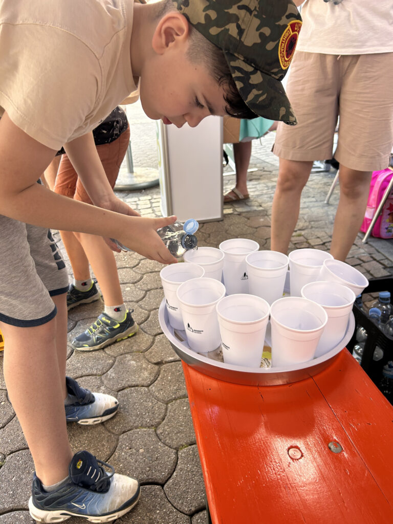 Unsere SchülerInnen zeigten u.a. in einem Experiment, dass auch schmutziges Wasser gesäubert und nach mehrmaligem „Reinigen“ getrunken werden kann (gut, ein bisschen „Erdegeschmack“ war noch vorhanden 😉), es gab für die Mosbacher Passanten kostenloses Wasser (inkl. tollem, wiederverwendbarem Becher) und bei einem Wasserquiz sowie einem Wasserkreis konnte man sein Wissen testen. Auch BM Rickenbrot schaute vorbei und hatte mit den Kindern viel Spaß beim Boote-Rennen. Einen eindeutigen Sieger gab es hierbei zwar nicht, aber erfrischend und spaßig war es allemal.