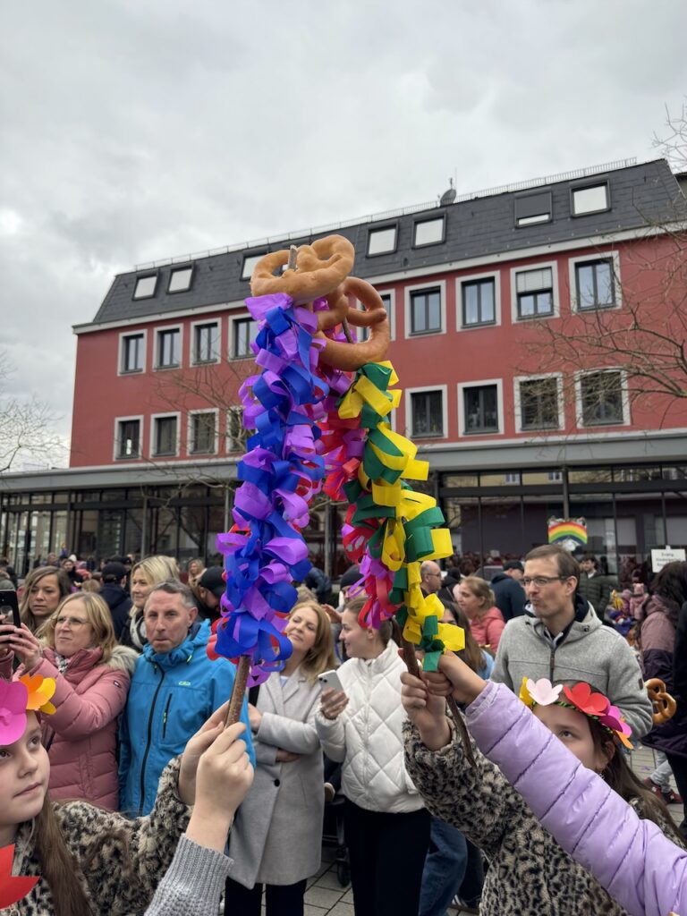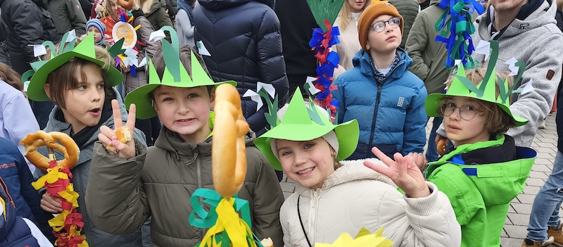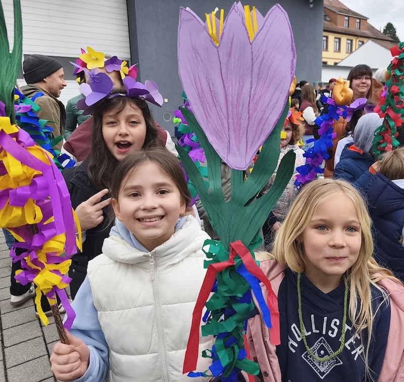 Auch die Wilhelm-Stern-Schule beteiligte sich am 15.03. mit einer Mottogruppe zum Thema „Frühblüher“ am Sommertagszug. Mit bunten Sommertagsstecken, kreativen Kostümen und fröhlichen Liedern wurde die nahende, warme und blühende Jahreszeit herbeigerufen. Heiß begehrt waren auch dieses Jahr wieder die leckeren Sommertagsbrezeln.